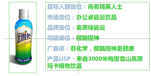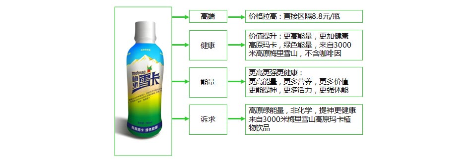 來(lái)自高原的瑪卡能量,綠色天然、安全健康、多喝養(yǎng)生,而目前統(tǒng)治市場(chǎng)以紅牛為主的能量飲品,主要是化學(xué)勾兌、含咖啡因、有害健康。因此,梅里雪卡深層次品牌內(nèi)涵是“高端健康能量,更能提神更加健康的能量“。