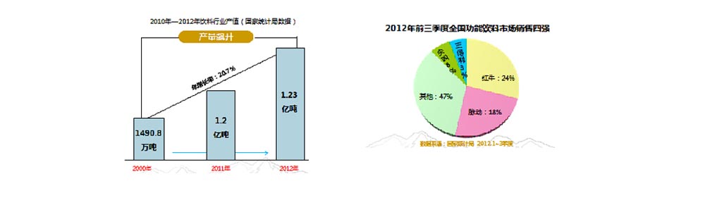 其中,功能飲料呈現(xiàn)出良好的發(fā)展勢(shì)頭。產(chǎn)品種類不斷增加,并且深受消費(fèi)者喜愛(ài), 2008 年功能性飲料整體增速約為29%,2012 年增速達(dá)到34%,功能飲料總?cè)萘?430--500億; 2012 年,我國(guó)已經(jīng)成為世界飲料第一大國(guó),其中功能飲料市場(chǎng)潛力巨大!