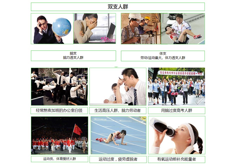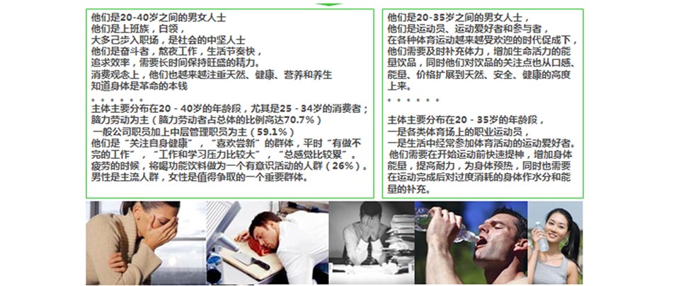 他們的都是20-40歲的城市白領(lǐng),新富階層以及運(yùn)動(dòng)員等,都屬于腦力透支或者體力透支的雙支人群。共同特征:他們關(guān)注的是能量飲料的品質(zhì)、健康、效果等因素。