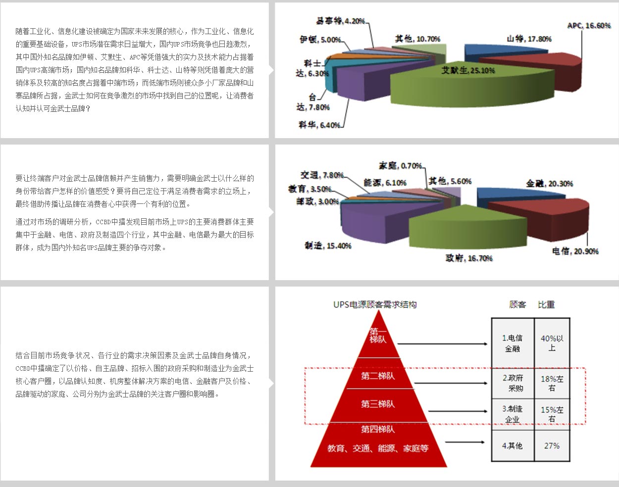由此CCBD中擂對(duì)政府、行業(yè)客戶及普通消費(fèi)者等金武士目標(biāo)及影響消費(fèi)群進(jìn)行深入調(diào)研。通過研究發(fā)現(xiàn)安全、可靠、實(shí)效、解決問題是目標(biāo)消費(fèi)者所最為關(guān)注的需求點(diǎn)。對(duì)于客戶來說,他們要的不僅僅UPS產(chǎn)品,而是一個(gè)完整的電力保護(hù)解決方案 。