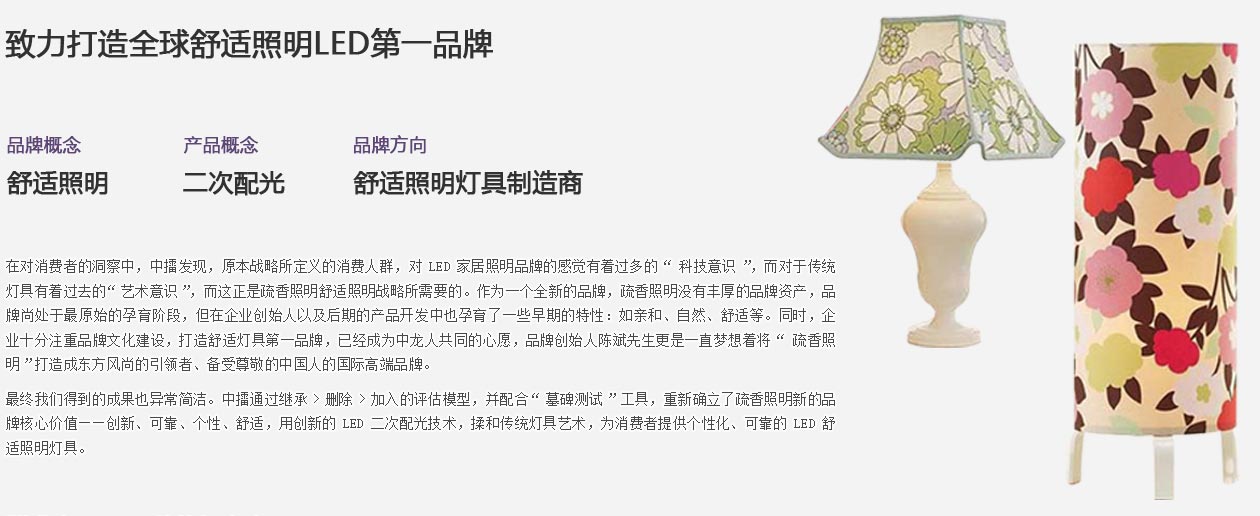本案,從中龍科技的品牌戰(zhàn)略入手,在對其品牌架構(gòu)梳理的基礎(chǔ)上,重點(diǎn)著力打造中龍科技旗下家居照明品牌——疏香照明。