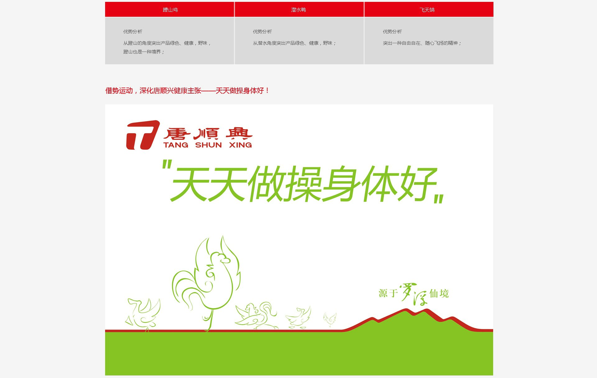 “蹬山雞”、“潛水鴨”、“飛天鴿”系列運動產品概念的提出,也正是結合了唐順興產品的特點。在走訪唐順興農場的時候,我們發現:唐順興的所有禽類都是半放養的,工作人員每天都會在固定的時間把雞鴨放出來,讓它們滿山奔跑,以此保證身體的健康和肉質的美味,這正是其它農場所不具有的自然資源,因此,中擂在此基礎上,進行挖掘,最終提出了“蹬山雞”、“潛水鴨”、“飛天鴿”系列運動產品。