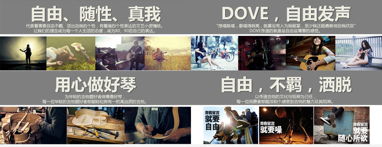 打造中國(guó)乃至世界木吉它民族領(lǐng)導(dǎo)品牌——DOVE品牌策劃手記DOVE專心做好心,為有音樂(lè)夢(mèng)想的人打造具有高性價(jià)比的高品質(zhì)時(shí)尚吉他產(chǎn)品,讓每一位熱愛(ài)吉他的年輕愛(ài)好者都能擁有...
